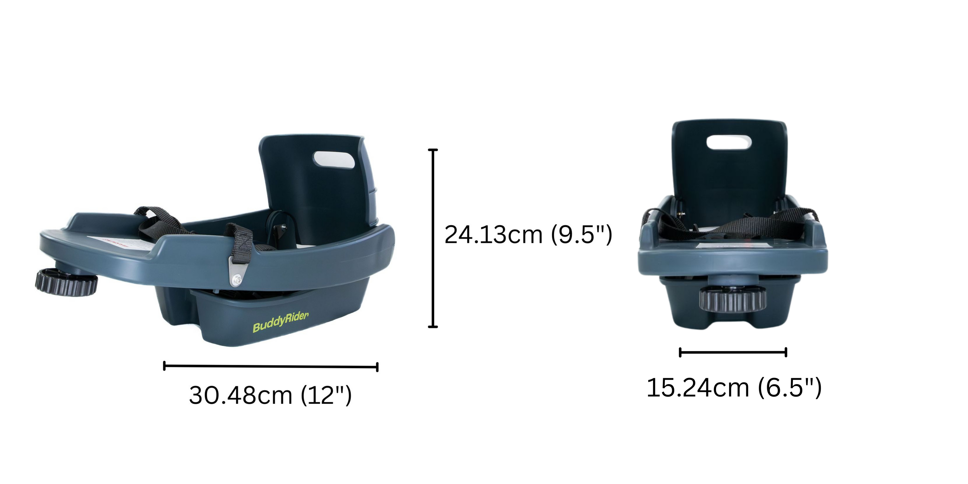 The BuddyRider® seat is 30.48cm (12") long x 15.24cm (6.5") wide x 24.13cm (9.5") tall. It was originally designed with a Parsons Terrier in mind (read our origin story here), but is flexible to fit a range of small to medium sized dogs.